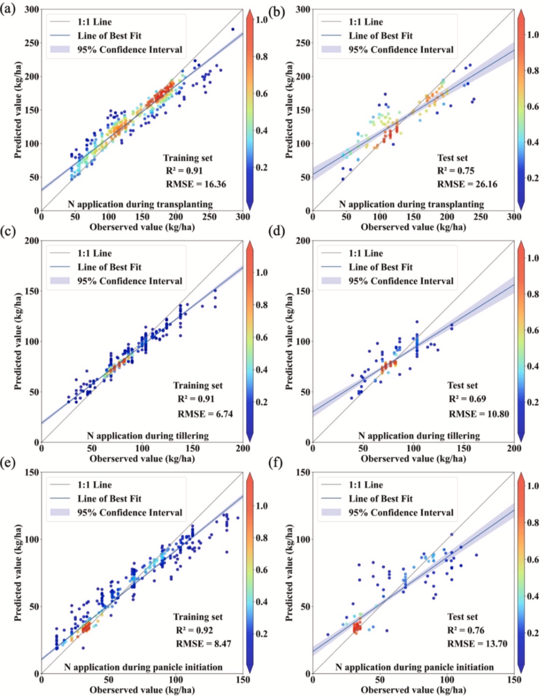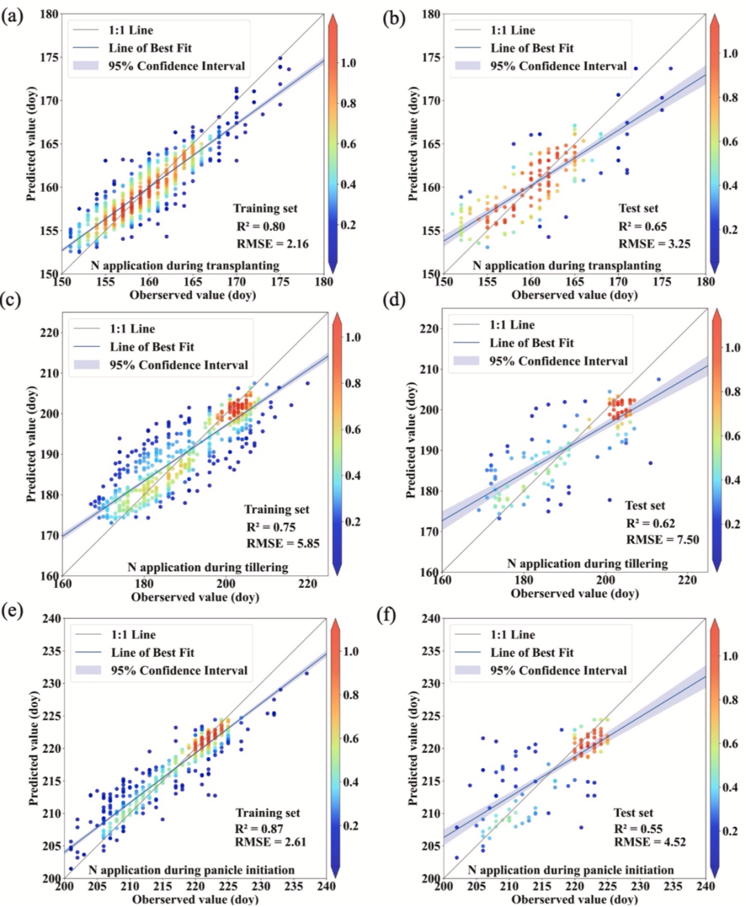 图 7.随机森林模型下多阶段施肥日期实测值与预测值对比。(a)、(c)、(e)分别为基肥、分蘖肥、孕穗肥施肥日期在训练集上的结果;(b)、(d)、(f)为对应在测试集上的结果。