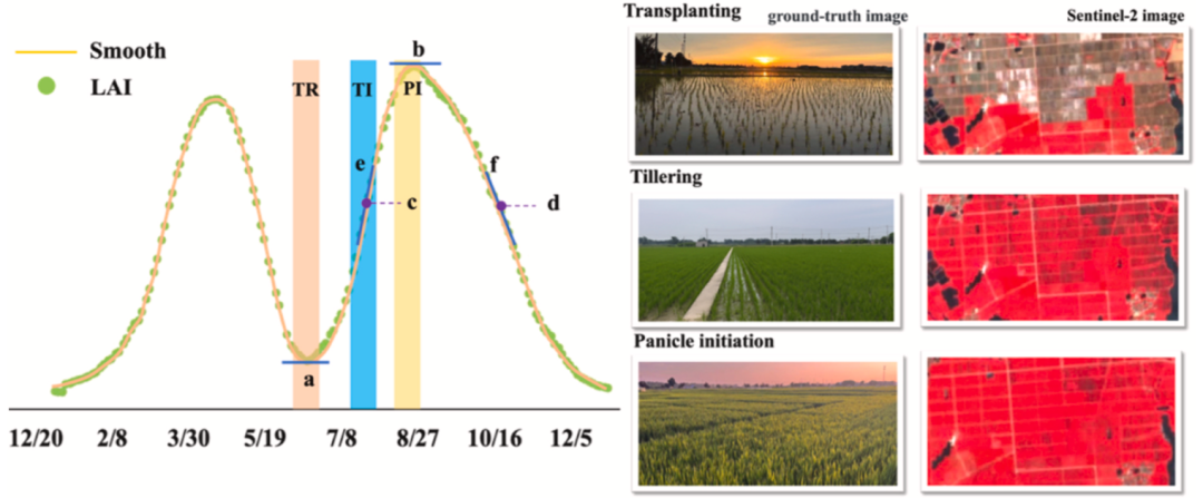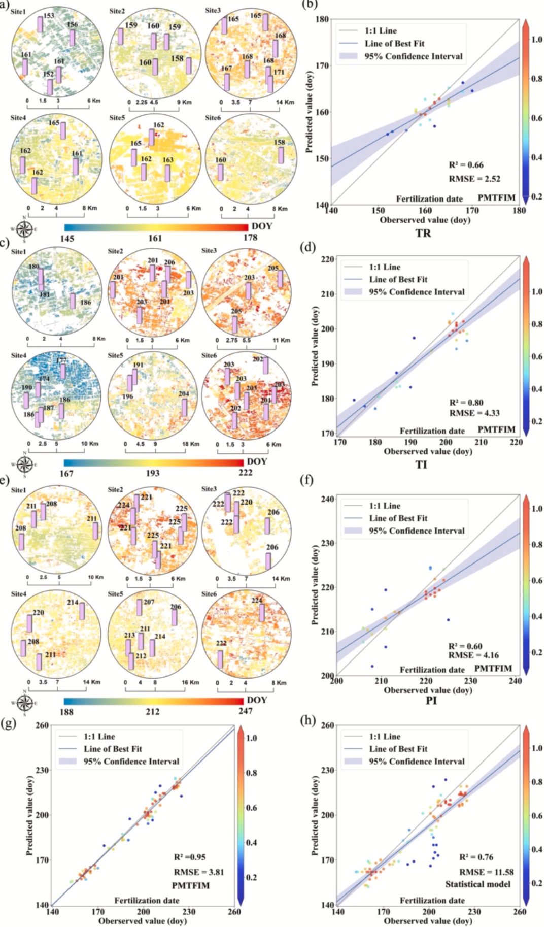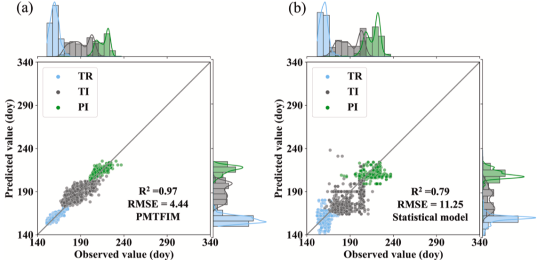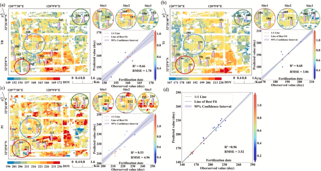 图 8.稻田施肥日期估算值与观测值的验证。其中,移栽期施肥(TR)、分蘖期施肥(TI)和孕穗期施肥(PI)分别用蓝色、灰色和绿色表示。