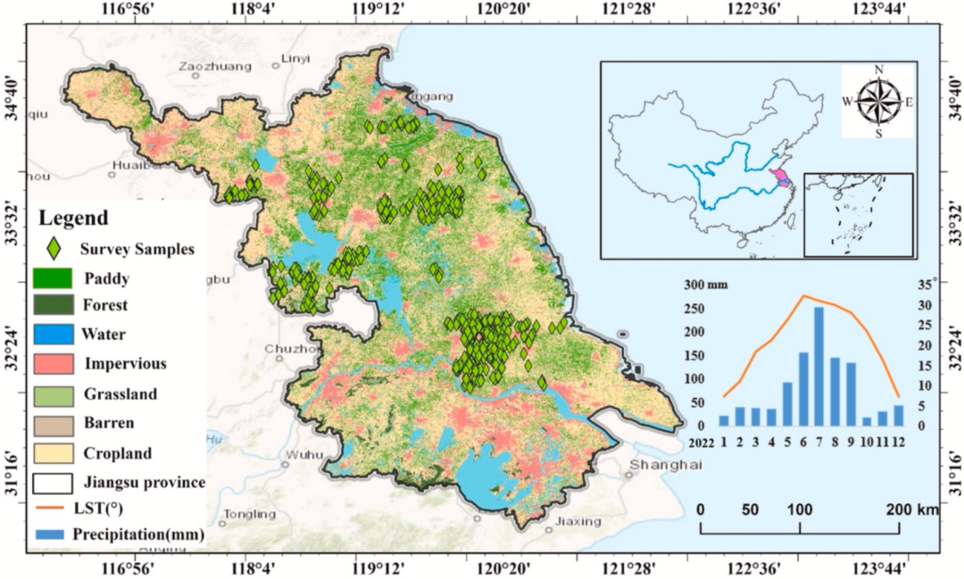 图 1.(a)江苏省在中国的地理位置,(b)江苏省月平均降雨量与地表温度(LST),(c)江苏省调查样本分布。