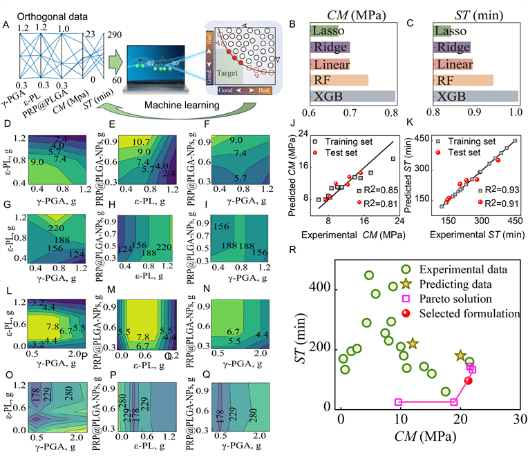 为了减少实验次数及缩小试验范围,能够快速地找到多种物质各方面性能的平衡。研究人员首先设计了正交试验,根据正交试验的结果,采用了五种机器学习(ML)算法:岭回归(Ridge)、线性回归(Linear)、随机森林回归(RF)和极限梯度提升回归(XGB)。鉴于在低数据场景中,我们通过三重交叉验证在所有模型中实施了网格搜索、随机搜索和贝叶斯优化超参数调整。我们发现使用贝叶斯优化可以获得最佳性能,产生最准确预测的算法被选为代理模型;由五个数据组成的独立测试集验证模型的泛化能力。随后,采用非支配排序遗传算法II(NSGA-II)确定帕累托前沿,该前沿由在特定组分空间内能够最佳平衡压缩模量(CM)与溶解时间(ST)这一对相互制约性能的材料组成构成。如图2所示,正交实验设计,最大似然算法训练和Pareto前沿识别可以进行迭代,并通过调整组成空间来发现最佳组合,最好地平衡互斥平衡压缩模量(CM)和溶解时间(ST)的性质。