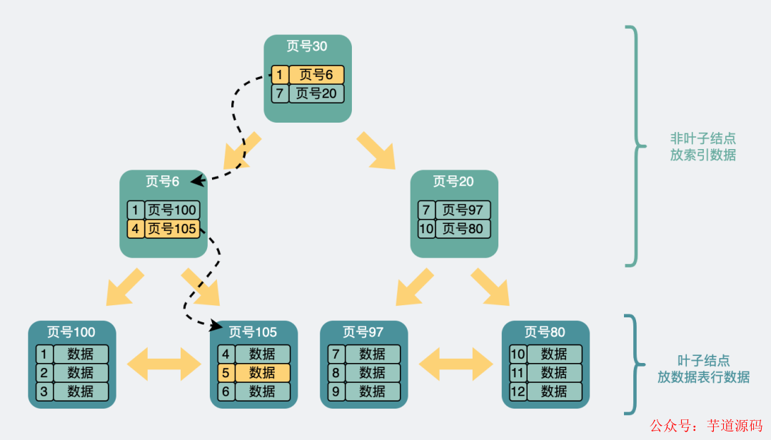 - 对于聚集索引,B+ 树的非叶子节点存储的是索引指针,叶子节点存储的是数据,顺序排列;