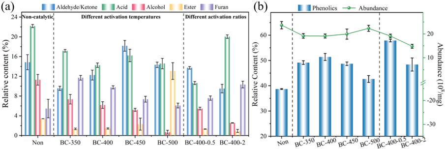N/O掺杂生物炭催化性能如图4所示,与非催化条件相比,N/O掺杂生物炭的引入显著提升了酚类化合物含量,同时降低了酸类物质含量。在活化温度为400 °C、活化剂/原料比为1:2时,BC-400-0.5催化剂表现出最佳催化性能,此时酚类含量达57.87%,较非催化条件提高19.18%。