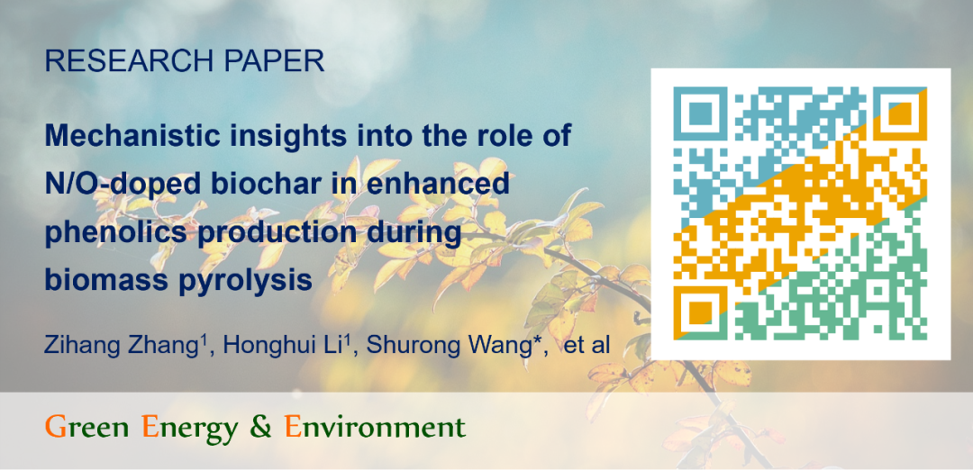 相关研究以“Mechanistic insights into the role of N/O-doped biochar in enhanced phenolics production during biomass pyrolysis”为题发表在Green Energy & Environment期刊,该论文第一作者为浙江大学博士研究生张子杭和硕士研究生李洪辉,通讯作者为浙江大学王树荣教授。