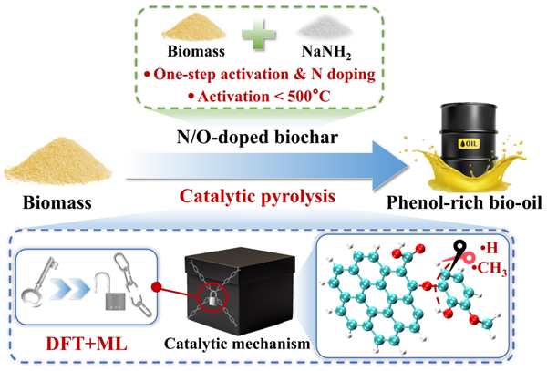 面对化石能源枯竭与碳排放的双重压力,生物质作为唯一可再生的碳中性资源,其通过热化学手段转化为高值燃料和化学品引发了广泛的关注。竹类植物是亚洲广泛分布的生物质资源,其生长过程中产生大量竹废料,其生长过程中会产生大量竹废料,若处理不当不仅造成资源浪费,还可能引发森林火灾等生态风险。通过热解技术可将竹废料生物质转化为高附加值产品,尤其是富含酚类化合物的生物油。这些酚类化合物不仅是重要的化工原料,还能进一步转化为航空燃料等高值产品。然而,直接热解得到的生物油通常组分复杂,且酚类物质选择性较低,限制了其进一步利用。N/O掺杂生物炭在生物质热解制酚方面具有显著的催化潜力,但目前制备方法存在活化温度高(600–900 °C)、合成工艺复杂等问题。此外,其微观催化机制仍不明晰。基于此,本研究提出了一种简便、温和的氨基钠(NaNH2)一步活化法,用于制备N/O掺杂生物炭以强化生物质热解制酚,并结合DFT计算及机器学习方法揭示了N/O掺杂炭在催化制酚过程中的微观作用机制。