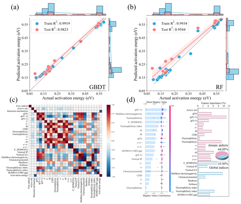为进一步分析催化机理,开发了四种机器学习模型分析自由基诱导脱甲氧基反应的活化能垒。机器学习模型的预测目标包括自由基进攻和甲氧基解离的活化能垒,输入变量包括自由基和反应类型、反应位点及描述碳簇模型微观性质的概念密度泛函理论(CDFT)计算结果,其中包含原子指数和全局指数。建模结果表明(图8),GBDT模型在预测N/O掺杂生物炭催化脱甲氧基反应活化能垒中性能最佳,预测R2为0.9823。原子指数和全局指数在预测活化能垒时重要性分别为64.05%和35.95%,其中Hirshfeld电荷和Mulliken电负性是影响催化性能最重要的DFT参数。