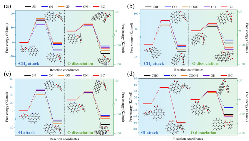 图6. N/O掺杂炭催化自由基进攻及甲氧基解离自由能变化:(a)、(b) •CH3进攻;(c)、(d) •H进攻。