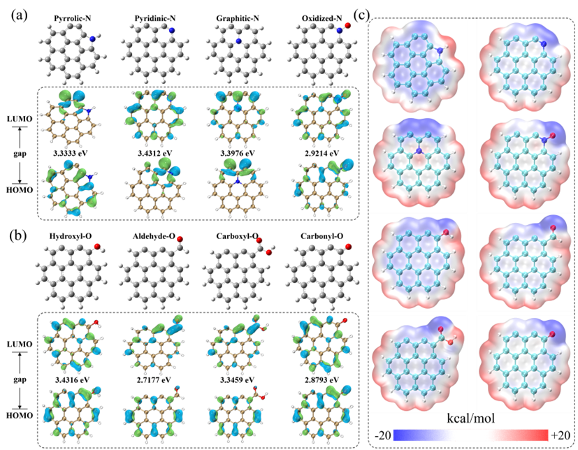 图5. N/O掺杂碳簇模型及分子特性 (a) N掺杂碳簇模型;(b) O掺杂碳簇模型;(c) 静电势分布。