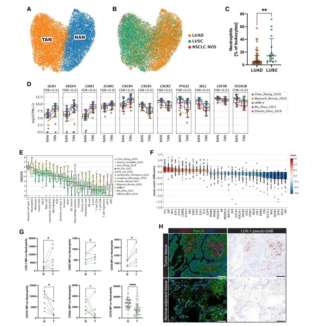 C:流式细胞术检测LUAD与LUSC肿瘤组织中中性粒细胞比例(占白细胞百分比)(LUAD n=47,LUSC n=16;Wilcoxon检验,**p<0.01)。水平线代表中位数,须线表示四分位距。
