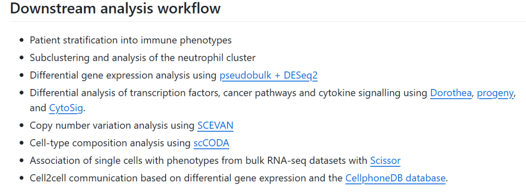 数据和代码 文章的数据队列,基本上都可以下载。提供的数据在这里: Processed input data:https://doi.org/10.5281/zenodo.6411867 可复现的代码:https://github.com/icbi-lab/luca 提供了清晰的分析步骤: 下游分析: 代码一撇: 看一个脚本: # --- # jupyter: # jupytext: # formats: ipynb,py:light # text_representation: # extension: .py # format_name: light # format_version: '1.5' # jupytext_version: 1.6.0 # kernelspec: # display_name: Python [conda env:.conda-scanpy_2020-12] # language: python # name: conda-env-.conda-scanpy_2020-12-py # --- import scanpy as sc import pandas as pd from glob import glob from pathlib import Path import re import scipy.sparse from multiprocessing import Pool import anndata filenames = glob(