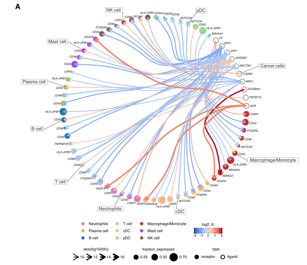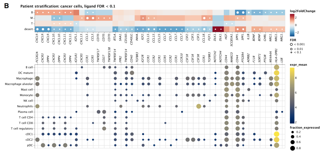 各患者亚型中的癌-免疫细胞通讯。上图:各亚型(B、M、T、ID)中癌细胞的差异表达配体(基于伪批量数据的DESeq2分析,FDR < 0.1)。下图:相应受体及其按细胞类型的表达情况。点的大小和颜色分别表示表达受体的细胞比例和基因表达水平(所有患者的平均值)。仅显示在相应细胞类型中至少10%的细胞表达的受体数据点。