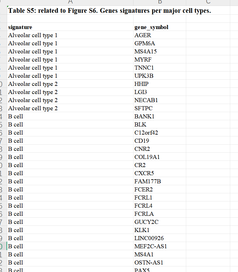 "male" , "f" : "female" }[s] for s in adata.obs[ "sex" ]] adata.obs[ "tissue" ] = "lung" adata.obs.drop_duplicates() # !mkdir -p "../../data/11_own_datasets/batch1_3patients/h5ad_raw" adata.write_h5ad( "../../data/11_own_datasets/batch1_3patients/h5ad_raw/batch1_3patients.h5ad" , compression= "lzf" ) 还有注释的marker表格: 文章分析大纲 通过整合19项研究、21个数据集共计298名患者的505份样本(图1A), 「首次构建了非小细胞肺癌核心图谱」 。这一综合性单细胞图谱汇集了经专家审定、质量保证且经过预分析的转录组数据,数据来源包括公开研究及我们自有数据集(UKIM-V),涵盖所有组织学类型的早期与晚期非小细胞肺癌。