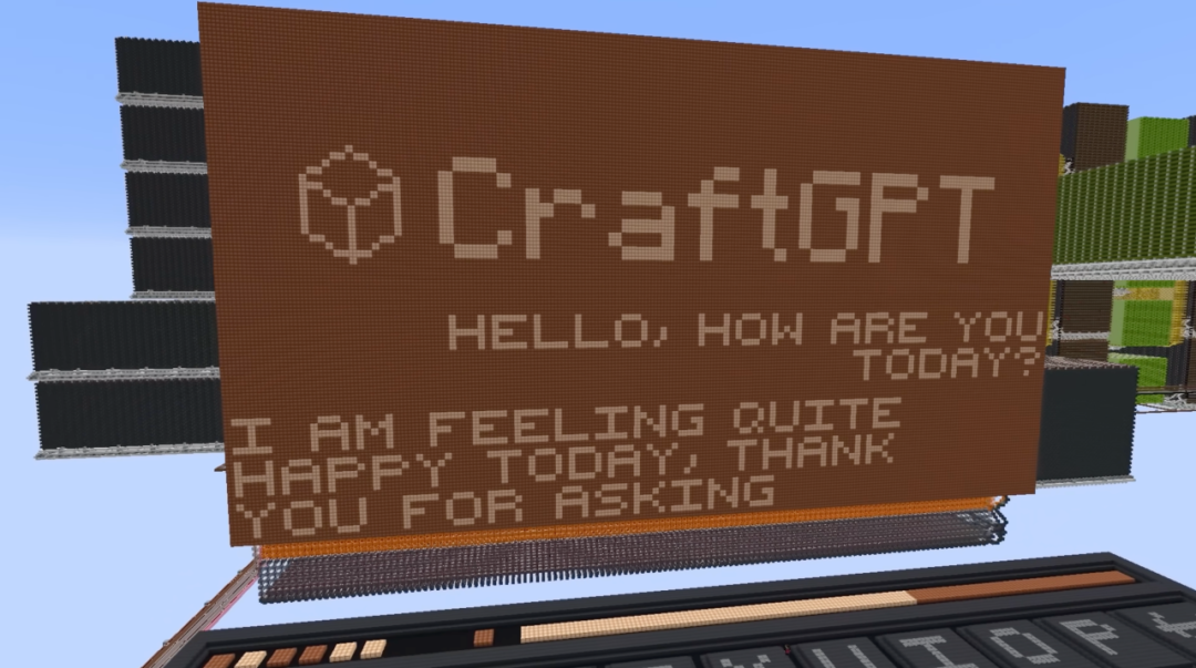 这样的开放世界游戏很多,但像Minecraft这么开放的没多少。当我还在地下深处的矿洞和绿皮僵尸激情肉搏时,博主Sammyuri已经在游戏里造出了一个能运行的简化版 ChatGPT,他将其称为CraftGPT。