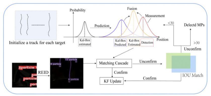 团队在计算机视觉与环境监测领域实现了跨界创新,他们结合了改进的YOLOv5-CA目标检测模型与DeepSORT跟踪算法,构建出可实时识别和追踪多颗粒微塑料的智能系统。YOLOv5-CA模型引入了“坐标注意力机制(Coordinate Attention)”,显著提升了对微小颗粒目标的识别精度;DeepSORT则通过深度特征匹配与卡尔曼滤波算法,实现了颗粒的稳定编号与轨迹还原。系统可在显微视频中实现99 %的检测成功率和85.3 %的平均识别精度,大幅优于传统人工或单颗粒算法。