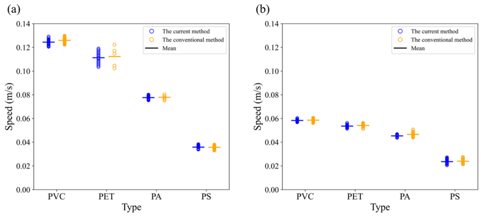研究中使用了四种典型塑料:PVC(聚氯乙烯)、PET(聚对苯二甲酸乙二醇酯)、PA(聚酰胺)和PS(聚苯乙烯),在不同粒径(1 mm与3 mm)下进行沉降实验。利用高分辨率相机实时采集沉降视频,并通过机器学习模型提取粒子轨迹和沉降速度。实验结果表明:模型测得的沉降速度与人工测量结果误差均低于1.7%;对小尺寸、高透明度颗粒仍保持>98%的识别准确率;实现了多颗粒实时同步追踪与速度分布统计(见图5)。