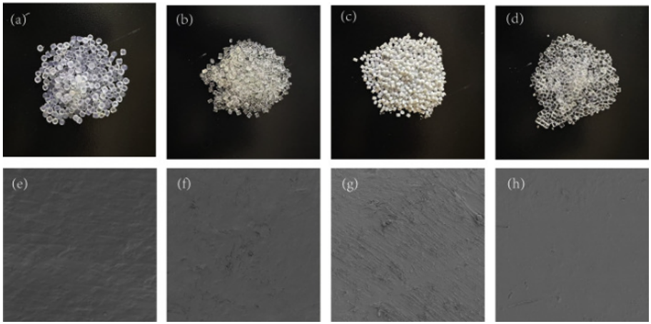 图1 实验中使用的MPs(a):PVC; (b):PET; (c):PA; (d):PS; (e):PVC的表面特性; (f):PET的表面特性; (g):PA的表面特性; (h):PS的表面特性)。
