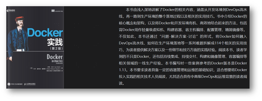不敢说这是学习Docker最好的一本书,但却是一本有一定提高,又能有所收获的书。面对一个新的技术,很多时候我们需要的也不是最好的材料,而是有个相对系统的材料。因为我们面对的是一个新的领域,有就是好,不去找最新的、最全的,而是拿起一份可以用的。