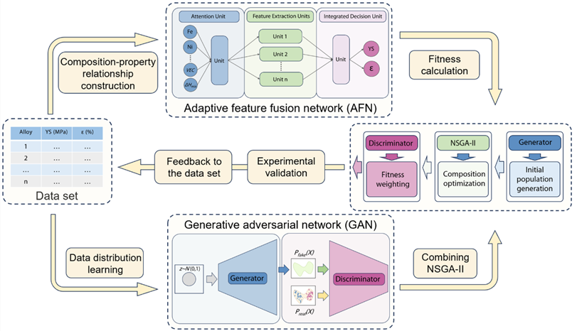 为应对上述困难,本文提出了一种融合深度学习模型与多目标优化算法的智能合金设计框架。该框架首先针对数据量小、噪声大的特点,设计了融合注意力机制与多通道特征提取模块的自适应特征融合网络(AFN),以提升性能预测的准确性与鲁棒性;同时,为了在高维稀疏成分空间中实现高效的成分优化,引入生成对抗网络(GAN)生成潜在优质初始样本,并结合非支配排序遗传算法(NSGA-II)进行多目标优化搜索;最终通过实验验证与数据回灌,构建模型—优化—实验的闭环迭代机制,实现合金成分的智能优化与实验可行性筛选。
