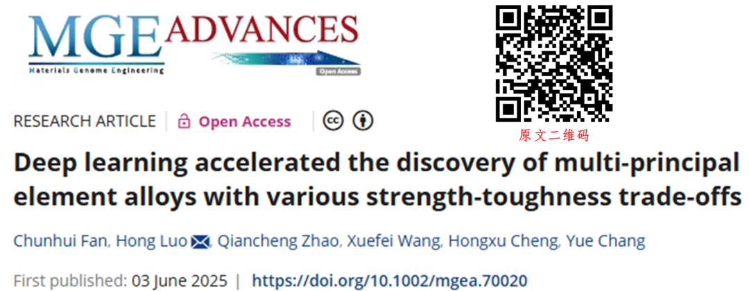Fan C, Luo H, Zhao Q,Wang X, Cheng H, Chang Y. Deep learningaccelerated the discovery of multi-principal elementalloys with various strength-toughness trade-offs.MGE Advances. 2025;e70020.