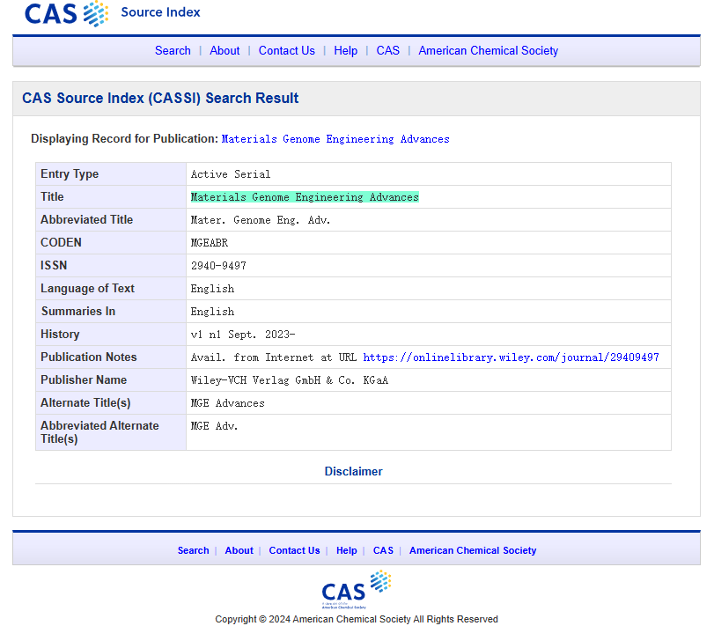 《材料基因工程前沿(英文)》(Materials Genome Engineering Advances,简称:MGE Advances)作为材料基因工程领域首个高水平综合性学术期刊,其宗旨是面向国家重点战略布局与材料学科国际学术前沿发展的重大需求,聚焦材料基因工程领域,刊载先进材料计算、高通量/自动化/智能化材料实验技术、材料数据库与大数据技术等材料基因工程关键技术的研究进展和前沿成果,以及三者在材料新效应/新原理探索和新材料发现等方面的重要应用,创建一个跨学科多领域交叉融合的国际一流高水平出版平台和学术交流平台,推动新材料研发模式变革。