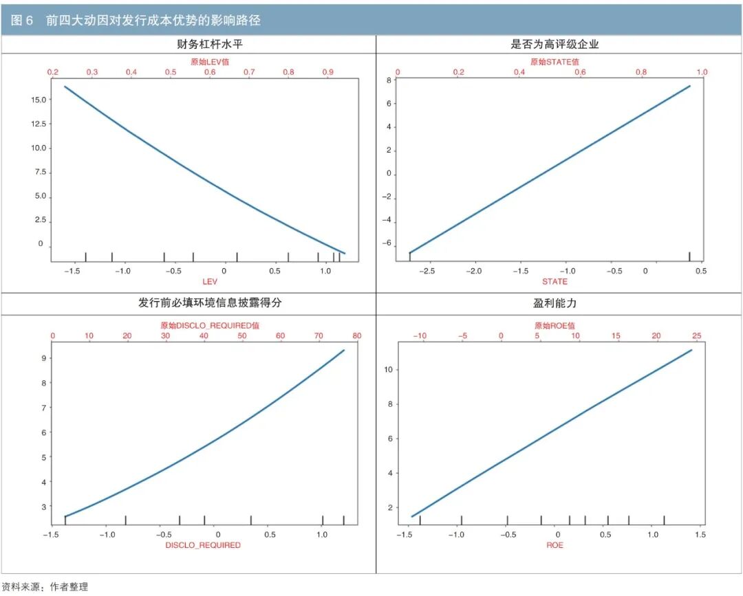 在40余个特征中,财务杠杆水平、是否为高评级企业、发行前必填环境信息披露、盈利能力是决定发行成本优势的前四大变量。财务杠杆水平位居第一,发行成本优势随资产负债率下降而提升。是否为高评级企业位居第二,高评级企业发行成本优势显著大于非高评级企业。发行前必填环境信息披露得分位居第三,按照金融行业标准《绿色债券环境效益信息披露指标体系》(JR/T 0322—2024)披露必填环境效益信息越完整,发行成本优势越大。盈利能力位居第四,绿色债券发行成本优势随发行人净资产收益率提高而增加(见图6)。