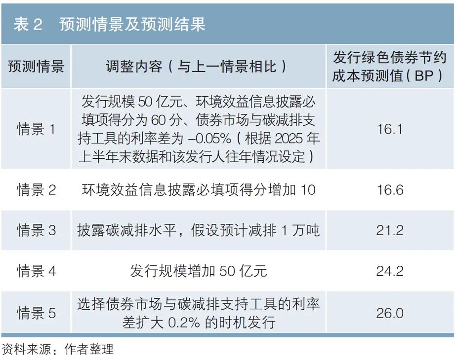 本文基于训练所得模型,以某政策性银行为对象,预测不同情景下发行绿色债券的成本优势及优化发行策略的方法。一是发行条件设定。假定该政策性银行2025年下半年计划发行绿色债券。基于2025年宏观经济目标,假设发行前上一季度GDP增长率为5%,市场特征参照2025年上半年末的情况设定,发行人特征和绿色特征参照该发行人的近期情况设定,假设绿色债券期限为发行人发行频次较高的3年期。二是预测情景设定。本文设定5个预测情景,每个情景调整一方面的债券条款,下一情景则在上一情景的基础上调整另一条款。其中,情景1为基准情景,设定发行规模为50亿元,根据该发行人2025年上半年的情况设定环境效益信息披露必填项得分60分(满分80分)、未披露碳减排信息。5个情景调整的条款分别为提高环境效益信息披露必填项得分、披露碳减排水平、增加发行规模、选择在债券市场与碳减排支持工具的利率差扩大时发行,各情景的设定条件及模型预测结果见表2。