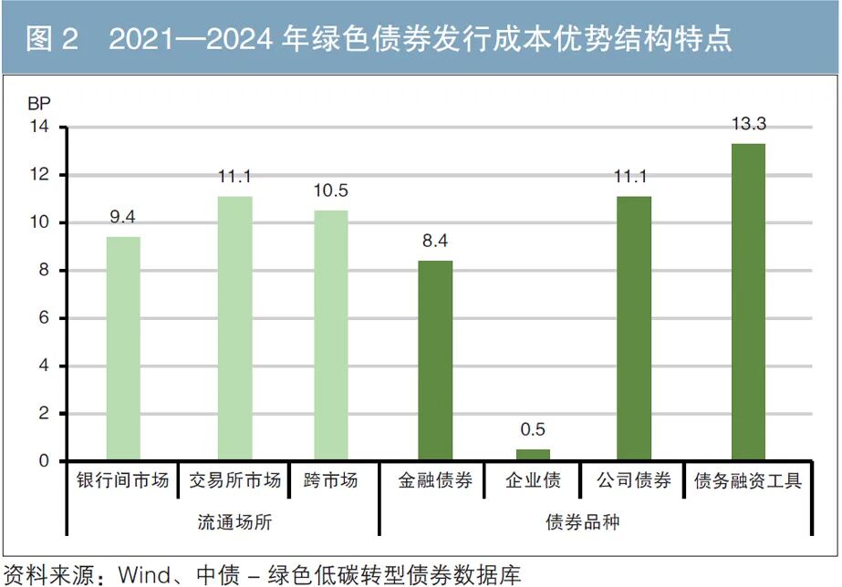 从绿色债券发行成本优势的结构特点来看,近年来,各流通场所及主要债券品种均有发行成本优势(见图2)。2021—2024年,银行间市场、交易所市场、跨市场平均绿色债券发行成本分别较普通债券低2 9.4BP、11.1BP和10.5BP,金融债券、公司债券、债务融资工具分别为8.4BP、11.1BP和13.3BP。绿色企业债发行规模减少,其发行成本优势不明显,为0.5BP。