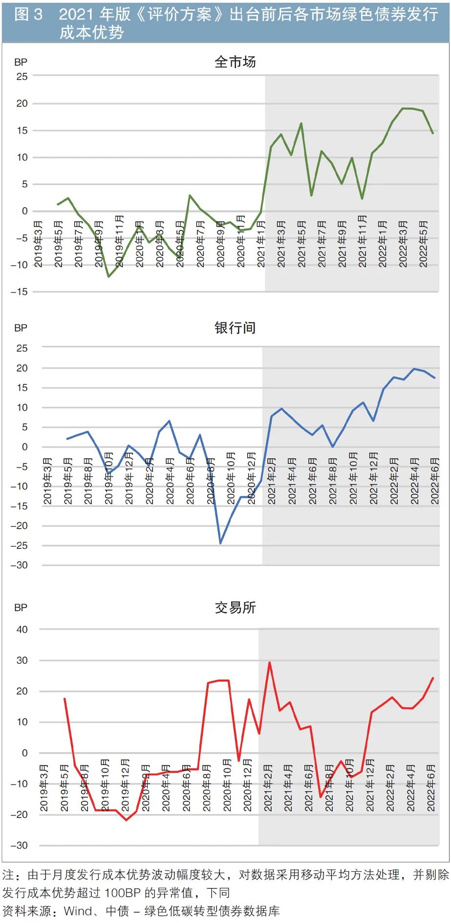 2.该数据为各流通场所绿色债券的平均发行成本优势。由于银行间市场相较于交易所市场普通债券的整体发行利率更低,因此,银行间市场相较于交易所市场绿色债券的发行成本降幅略小。具体到个券层面,交易所市场绿色债券发行成本优势波动较大,银行间市场绿色债券发行成本优势相对更加稳定。