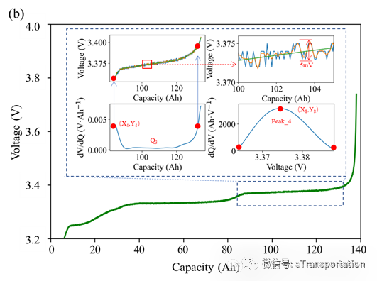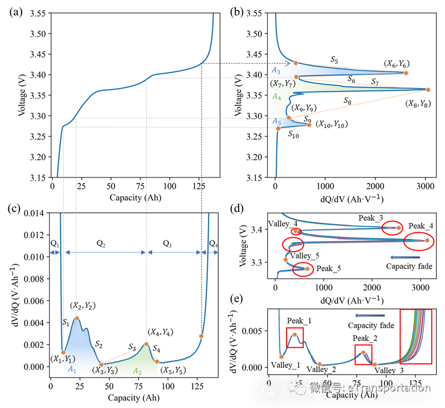 差分方法(differential methods),包括增量容量分析(ICA)和差分电压分析(DVA)。其已被广泛证实能够精确定位锂离子电池容量的退化机制。差分分析曲线的特征演变可以宏观表明与电池退化密切相关的LLI和正负极LAM的存在。为了充分挖掘反映物理退化机理的潜在信息和定量分析电池健康状况,本研究共创建了39个特征,包括从差分电压分析曲线中提取的20个特征和从增量容量分析曲线中提取的19个特征(图3)。