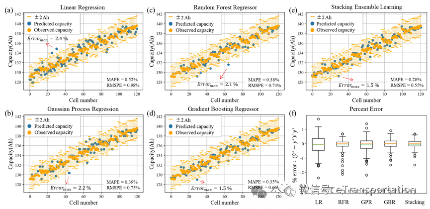 基于以上描述的机器学习方法,作者首先将420个电池单体的数据集分为训练集及测试集。其中,300个电池单体作为训练集,以训练机器学习模型的架构及参数。测试数据(120个单体)用于评估模型的泛化性能。使用机器学习技术(4个基础学习器及stacking集成学习)对训练集的估计误差如图5所示。训练集中电池寿命估计百分比误差在 0.01% - 1.2% 之间。验证了基于差分分析生成的特征工程具有高预测能力。之后,通过随机样本生成的测试数据集进行模型评估。如图6所示,测试集中120个电池健康状态预测的 MAPE 在 0.35% 到 0.52% 之间,四个基础学习器的 RMSPE 在 0.66% 到 0.98% 之间,表明4种基础学习器均可以有效用于电池健康状态的准确估计。stacking堆叠集成机器学习,可以产生最优的估计结果:0.28% MAPE 和 0.55% RMSPE。基于特征的集成机器学习技术实现了准确的电池健康状态估计(± 0.5% 最大百分比误差,第一和第四分位数小于 ± 0.1%)。预测模型是精确且足够稳定的。
