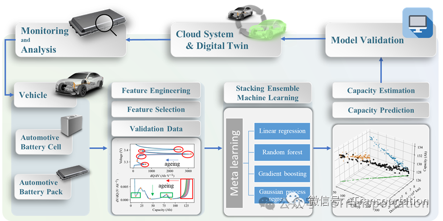 针对这一问题,美国加州大学戴维斯分校的赵竞园博士提出了基于stacking集成机器学习的动力电池寿命辨识及预测方法。使用420个电池单体和9个电池包组成的综合数据集进行模型特征参数空间的探索,产生了10,000 余个验证及测试数据。试验表明,模型可以高精度地预测动力电池的健康状态,并且可以预测一定周期后的动力电池剩余使用寿命。开发的基于物理特征的stacking集成学习机器学习方法具有较高的准确性,鲁棒性及泛化能力。