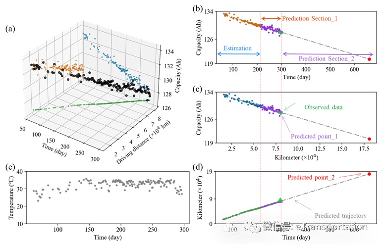 动力电池在实车应用中有两个重要参数:行驶里程(公里)和服务时间(年)。针对这一特殊应用场景,本文采用这两个指标来量化预期的剩余使用寿命。如图7所示,利用stacking集成机器学习的SOH历史估计值,基于回归分析,可有效建立动力电池的寿命衰减轨迹,进而获取该动力电池在未来一定周期内的剩余使用寿命。图7(a)所示为三维坐标下(容量、里程、时间)的动力电池实时使用寿命。7(b),7(c)和7(d)分别为7(a)在二维平面的投影,其中estimation区间为SOH估计结果,prediction区间为RUL预测值。Observed data (绿色三角形) 为RUL预测模型的验证数据。Predicted_point_1为该点的观测数据,以验证和优化模型预精度,Predicted_point_2为该动力电池在运行1年后预期的健康状态。图7(e)为日常温度变化数据。