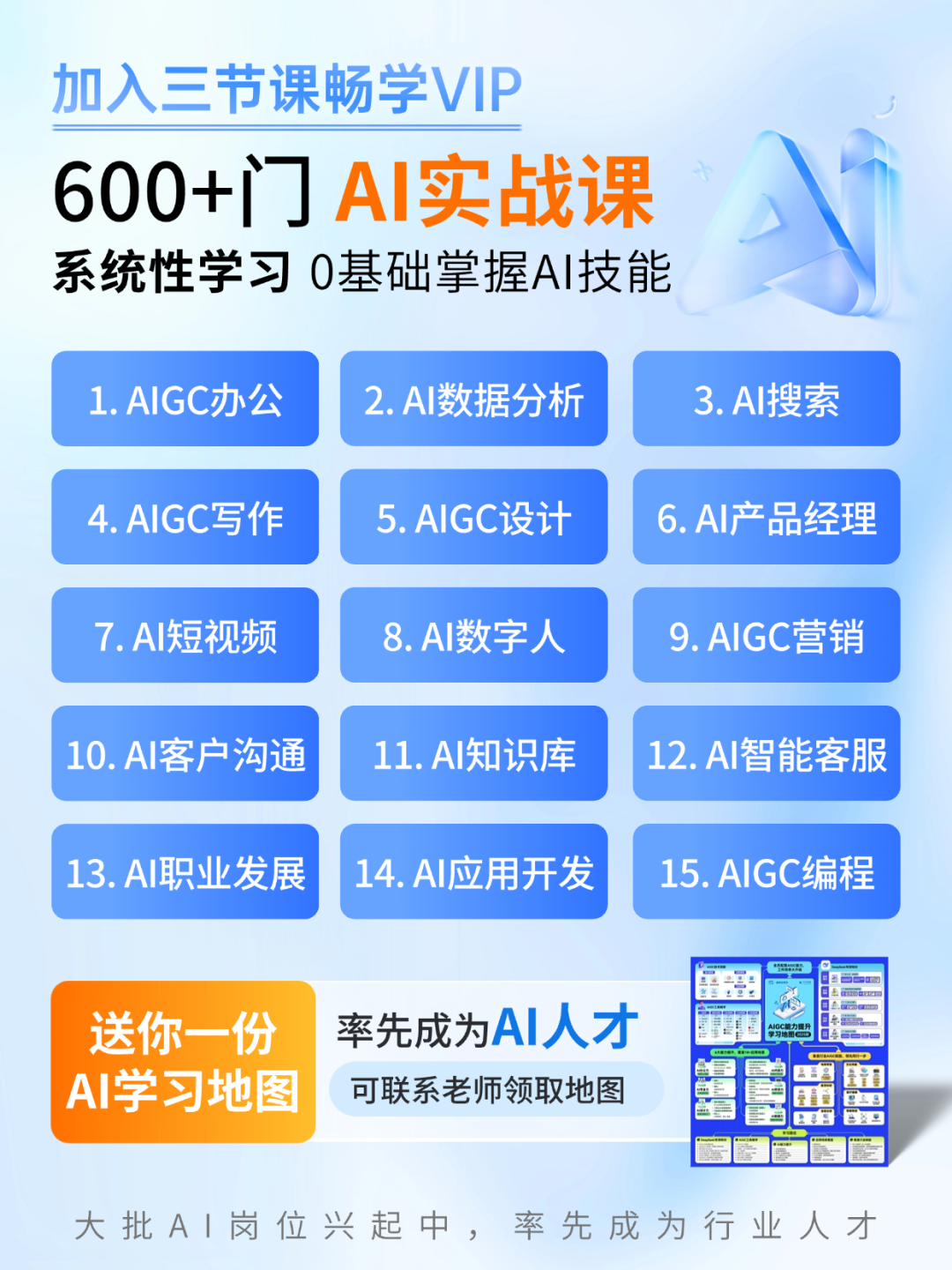 地图分为六大板块,为大家整理了关键知识点,还匹配了系统的学习路径(课程),能够有效系统,帮大家快速掌握AIGC技术并应用于实际工作,从而全面提升效率。今天,我们基于当下市场需求,全新推出《2026版 AIGC学习地图》。内容不仅新增了 AI Agent 开发、大模型和企业知识融合这些硬核技术,在垂直行业的应用场景拆解也更细致,还推出了 AIGC 岗位认证体系。不管是想深挖技术、落地业务,还是考个认证给自己职业加码,这张地图都能带你一步步实现,让你在 AIGC 浪潮里从 “跟跑” 变 “领跑”!今日扫码添加工作人员,就可以免费领取这张学习地图👇如果你是三节课新同学,也欢迎你来三节课跟着地图全面免费学习AIGC课程,具体课程如下👇