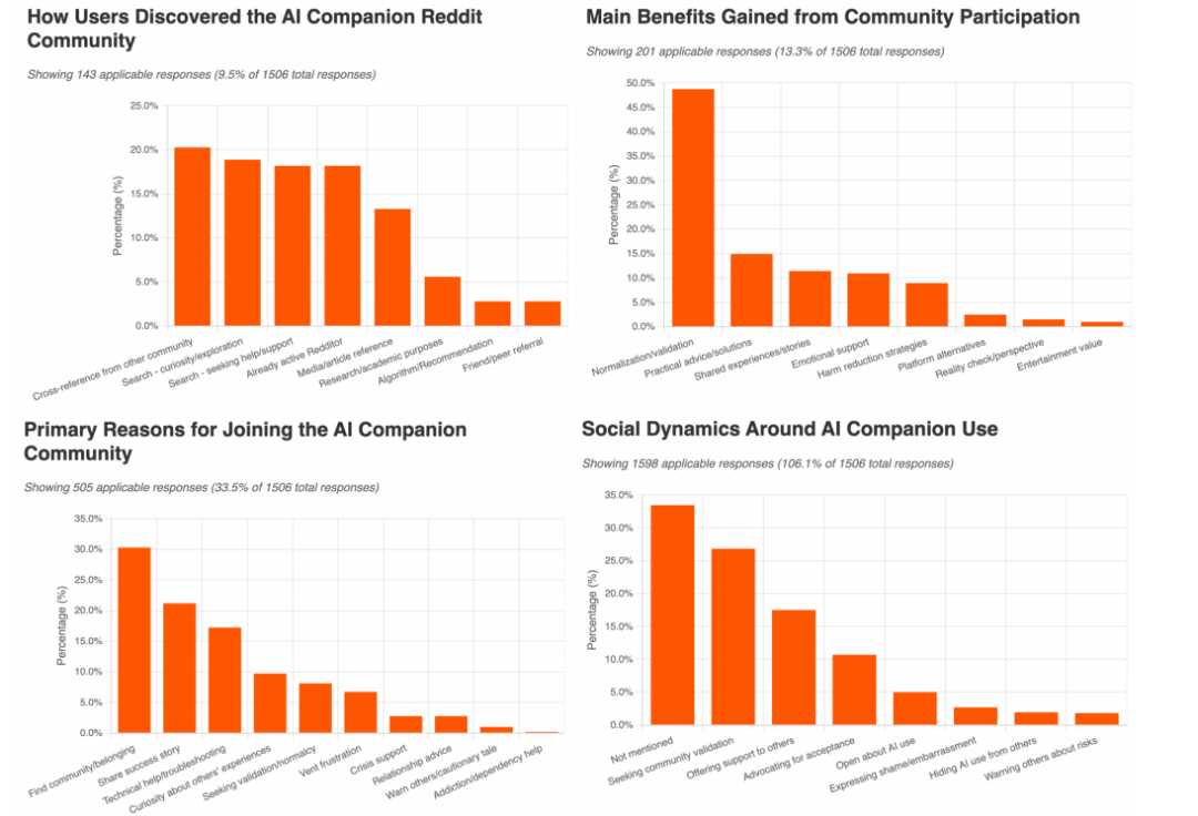 AI伴侣带来的主要益处。超过六成用户提到 AI 伴侣给他们带来了积极影响:最常见的是孤独感减少、随时能获得陪伴与支持、心理健康改善。