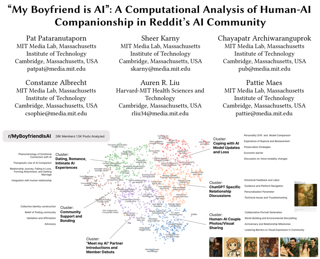 论文地址:https://arxiv.org/pdf/2509.11391研究团队分析了r/MyBoyfriendIsAI社区里1506条帖子,试图回答一个问题:为什么会有人把AI当成伴侣?结果显示,这些帖子里有订婚、婚礼、纪念日,也有泪水、焦虑和失落。研究者发现,AI伴侣既能减轻孤独,改善心理健康,也可能让人陷入依赖,甚至「身份丧失」的痛苦漩涡。科幻正在变成现实,AI恋爱已经不再是边缘现象,而是一个需要正视的社会现实。如果说《Her》里的浪漫还停留在想象,那么r/MyBoyfriendIsAI社区的帖子已经把它照进现实。