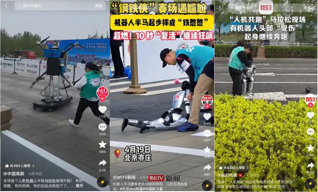 被很多网友揶揄的北京亦庄机器人马拉松赛事即是一例。2025年4月,该人形机器人马拉松赛事聚集了知名机器人及智能制造生态企业超过300家,参赛机器人需要工程师团队全程跟随,负责更换电池、处理失衡等突发状况。比赛视频显示,有的机器人跑着跑着平地摔倒;有的机器人颤颤巍巍,走不出直线;有的机器人甚至直接把头部摔掉了。