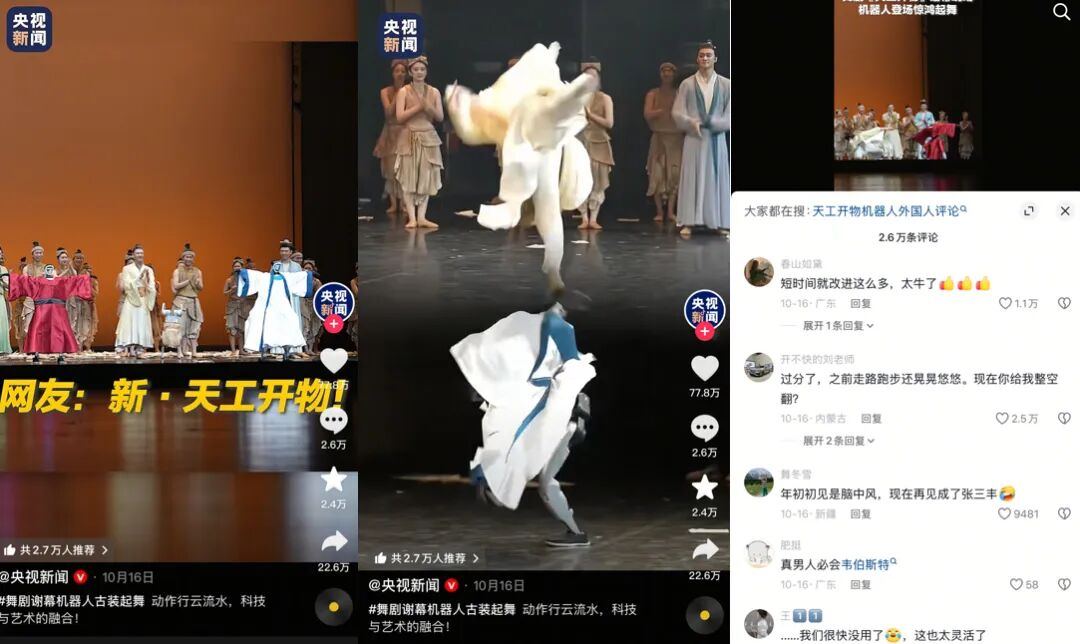 机器人表演就颇为显眼。在2025年1月的央视春晚上,宇树科技机器人H1表演的《秧Bot》仅是根据节奏扭动身体和转动手帕,动作相对简单。到了2025年10月,在舞剧《天工开物》的谢幕环节中,宇树科技机器人已能精准复现舞者姿态,以流畅的侧翻、后空翻等完成“人机共舞”。