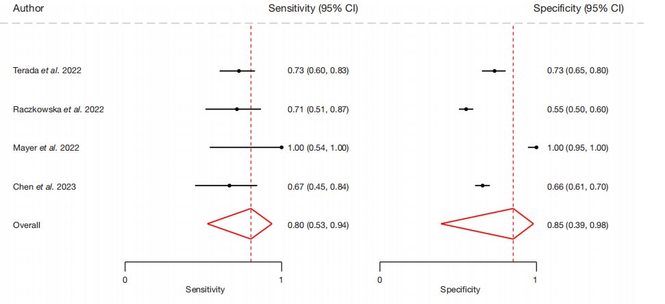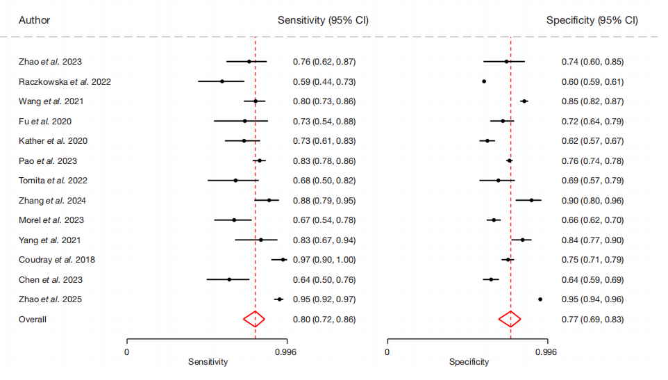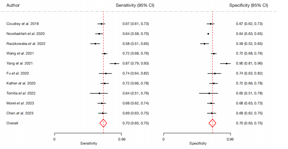 荟萃分析结果显示,不同驱动基因的预测准确性存在一定差异。其中,ALK融合的预测表现最为突出,总体敏感性为80%(95% CI,53%–94%),特异性为85%(95% CI,39%–98%),AUROC超过0.8,显示出较高的辨识能力。EGFR突变的预测结果亦较为理想,敏感性为80%(95% CI,72%–86%),特异性为77%(95% CI,69%–83%),提示模型在识别EGFR突变样本方面具备良好的一致性和稳定性。