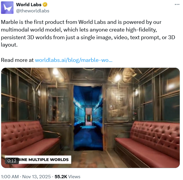 它能够从文本、图像、视频乃至粗略的3D布局中重建、生成和模拟三维世界,并允许人类与智能体与之互动。这种具备空间智能的世界模型,将在未来几年内深刻变革游戏、视觉特效(VFX)、设计、机器人等众多行业。