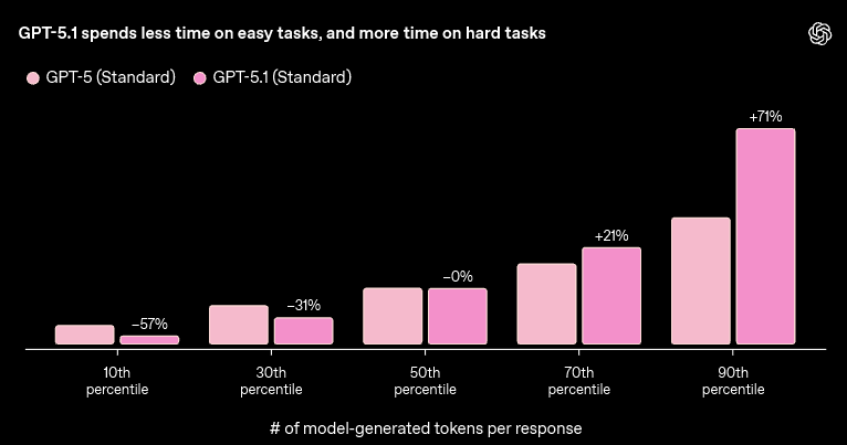 在处理最简单的10%任务时,GPT-5.1 Thinking的输出量减少了57%,意味着响应速度可能提升近一倍。用户不再需要为一些简单查询而经历不必要的等待。