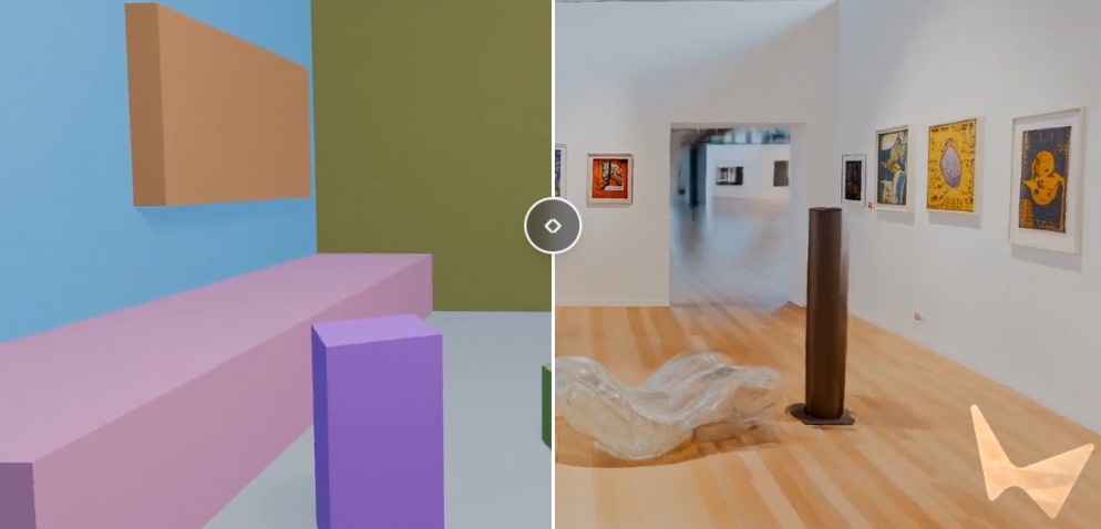 例如,你可以先用简单的几何体搭建一个现代艺术博物馆的布局,然后通过文本提示:一个美丽的现代艺术博物馆,有木地板,充满了色彩斑斓的画作和曲线优美的雕塑,赋予其灵魂。