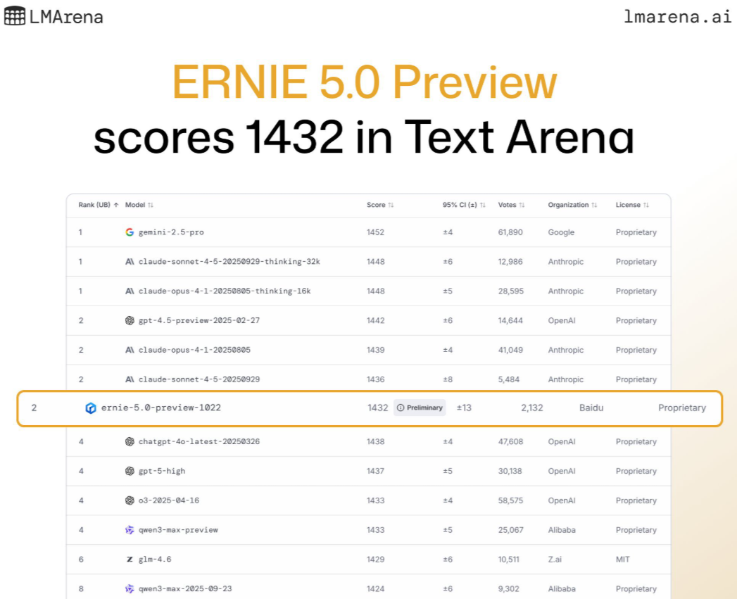 其早些时候发布的“文心 5.0 Preview 1022”版本,已经在LMArena上排名世界第二,国内第一。新版估计更强。
