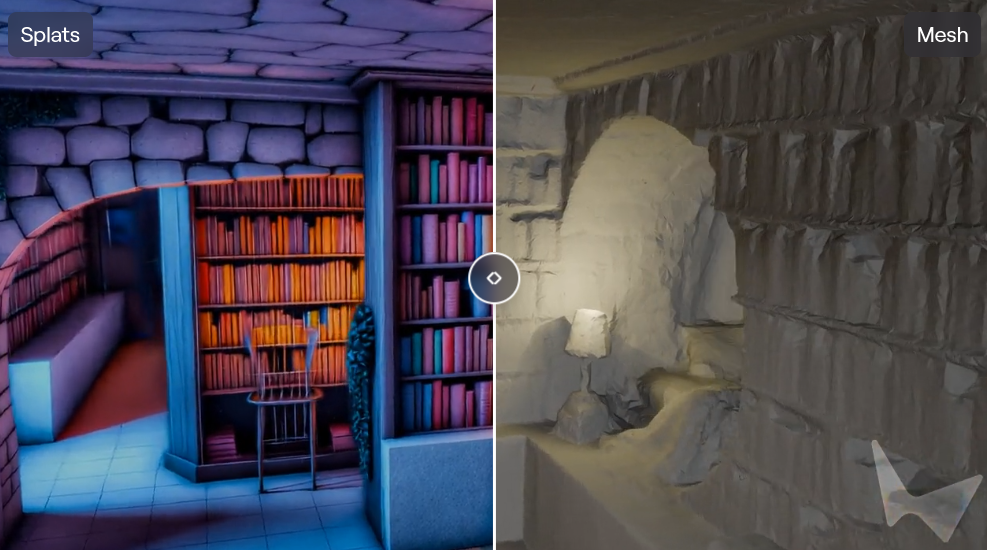 高斯溅射(Gaussian splats)是Marble世界保真度最高的表示方法。它将3D场景表示为大量半透明粒子的集合。你可以使用World Labs集成了THREE.js的开源跨平台渲染器Spark,在浏览器中渲染高斯溅射图。