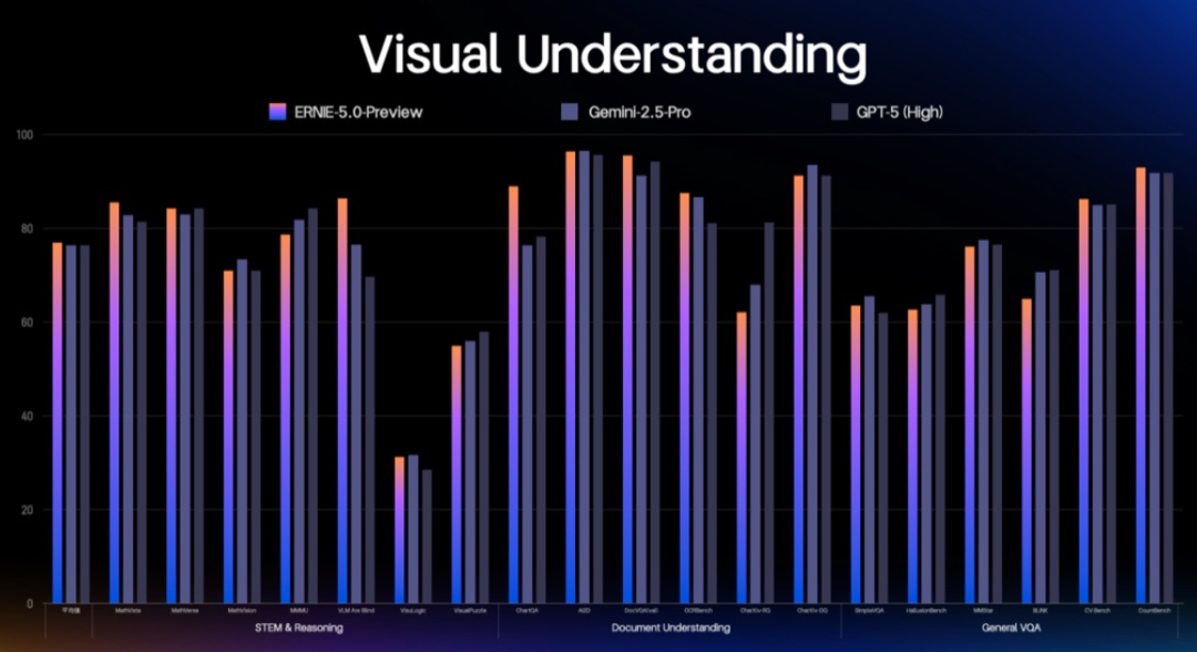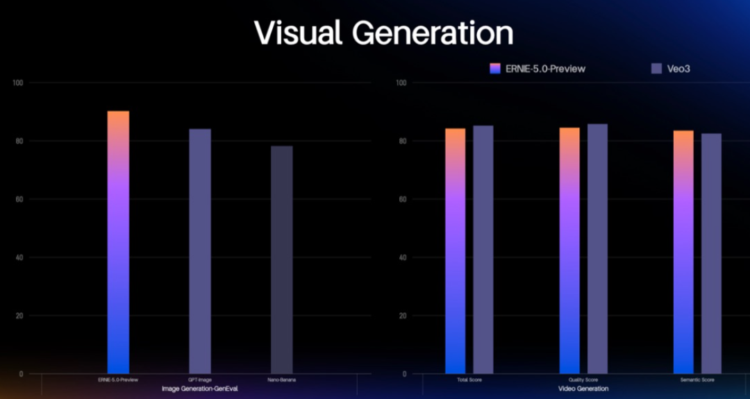 从跑分成绩看,在40余项权威基准的综合评测中,文心5.0 Preview的语言与多模态理解能力,与Gemini-2.5-Pro、GPT-5-High等顶尖模型持平;其图像与视频生成能力,也足以和专注于这些领域的垂直模型相媲美,达到了全球领先水平。