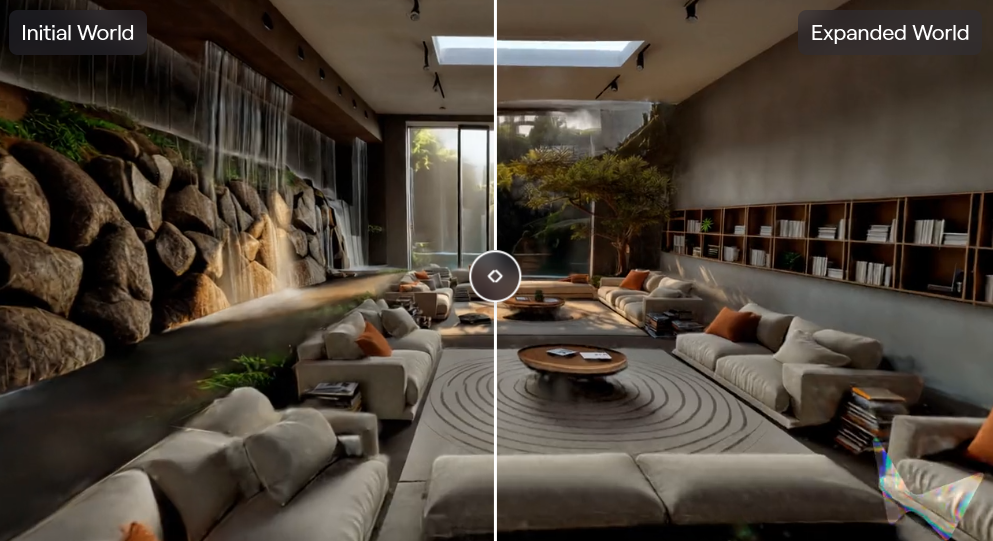 在一个世界生成后,Marble允许一键式扩展来使其变得更大。你可以选择世界的一个区域进行扩展,Marble会自动创造更多内容来填充该区域。
