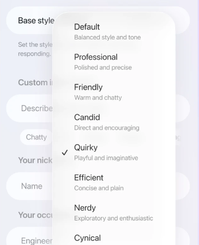 今年早些时候推出的语气预设选项得到了优化和扩展。原有的默认、友好、高效模式在更新后保留,并新增了三种风格:专业、坦率和古怪。
