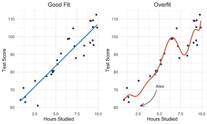 但右边图表中的红线只与大约四个点相交,因此为了追求完美,模型对新一组学生的预测结果非常糟糕。
