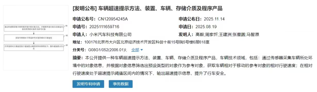 小米汽车科技有限公司申请的“车辆超速提示方法、装置、车辆、存储介质及程序产品”专利于今日(11 月 14 日)公布。专利摘要显示,本公开涉及车辆技术领域,包括:通过传感器采集车辆所处环境中的对象信息,并根据对象信息筛选出预设类型的对象作为参考对象,获取车辆相对于移动的参考对象的相对行驶速度;在相对行驶速度处于超速提示阈值区间内的情况下,输出超速提示信息,提升了行车安全。