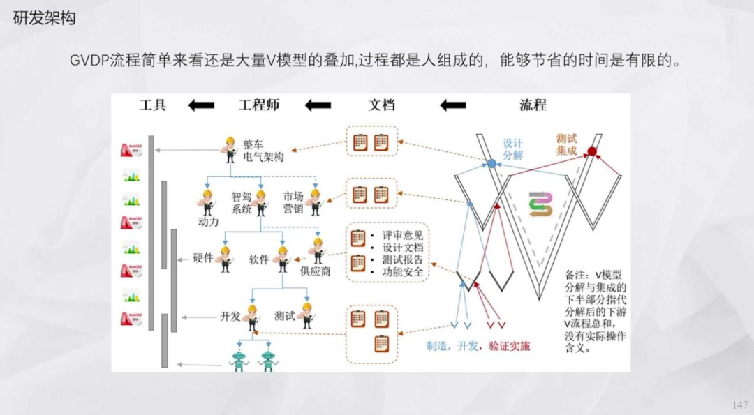 传统研发流程(如汽车行业的 V 模型)依赖 “流程、文档、工程师、工具” 四要素,但存在明显短板:流程易受人为因素影响(如紧急上线时跳过评审);文档与工具脱节(如邮件传输导致信息滞后);效率随开发周期压缩而下降(如评审时间不足)。