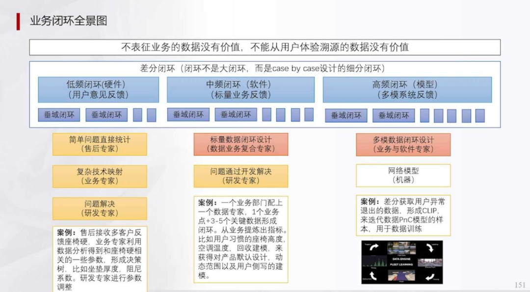 低频闭环:处理用户意见反馈(如漆面颜色评价),依赖售后专家与研发团队协作,自动化程度低;中频闭环:处理标量数据(如传感器数值),由数据专家与研发人员配合,可实现半自动化(如通过算法筛选关键参数);高频闭环:处理辅助驾驶算法迭代等高频任务,依赖数据闭环专家,自动化程度高(如模型自动训练、筛选器自动优化)。
