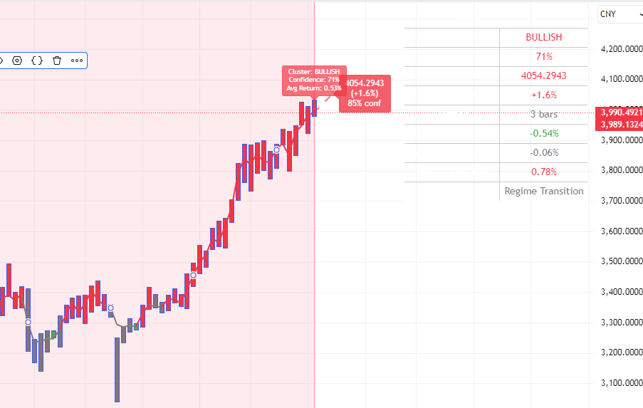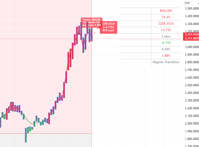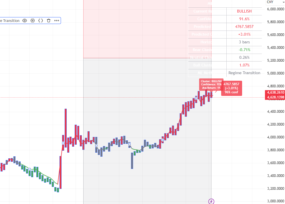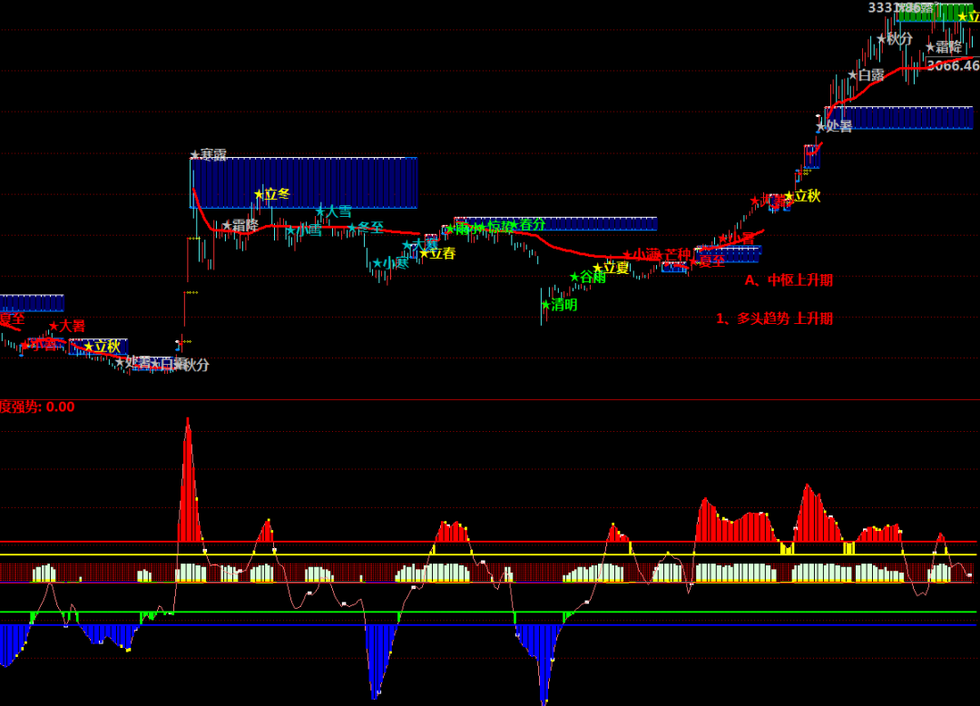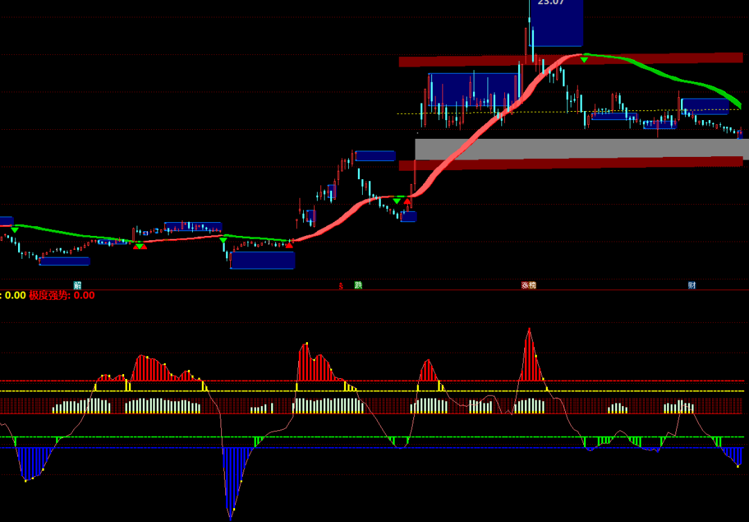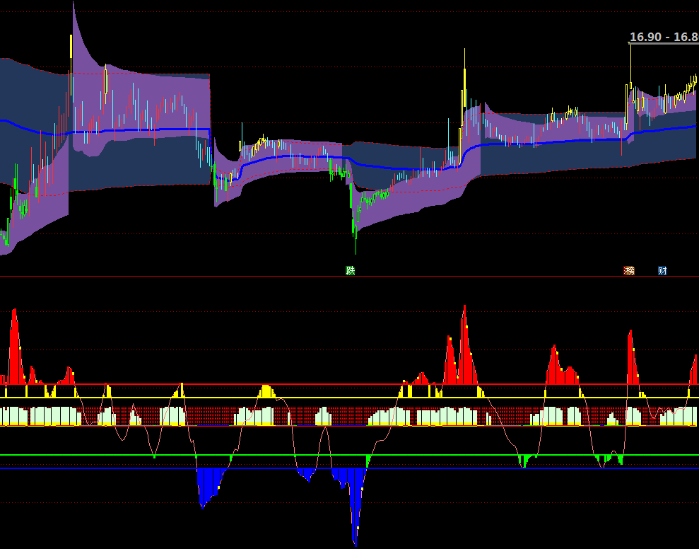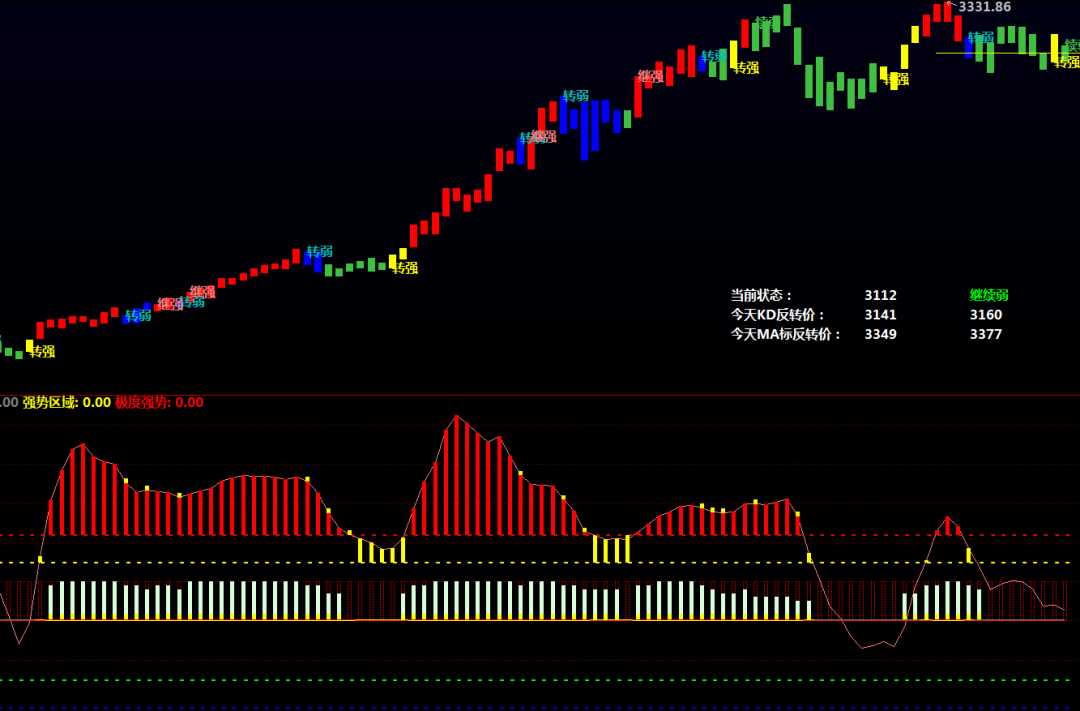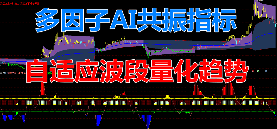 MACD持续:=COUNT(MACD金叉,5)>=3;RSI持续:=COUNT(RSI强,5)>=3;CCI持续:=COUNT(CCI强,5)>=3;持续强度:=(KD持续+MACD持续+RSI持续+CCI持续)*10;动量持续:=(综合强度+持续强度)/2;STICKLINE(1,50,0,1,-1),COLORRED;李津3:=李津4;STICKLINE(MA(C,5)>MA(C,10),10,0,1,0),COLORYELLOW;STICKLINE(MA(C,5)>MA(C,10),动量持续+10,10,1,0),COLORD9FFD9;波动率:=STD(C,20)/MA(C,20)*100;波动类型:=IF(波动率>10,3,IF(波动率>6,2,1));趋势强度:=ATAN((MA(C,20)/REF(MA(C,20),20)-1)*100)*180/3.14159;趋势类型:=IF(趋势强度>4,3,IF(趋势强度>2,2,1));量能系数:=MA(V,20)/MA(V,60);李津2:=李津3;量能类型:=IF(量能系数>2,3,IF(量能系数>1.2,2,1));动态周期:=IF(波动类型=3,18,IF(波动类型=2,22,26));动态平滑:=IF(波动类型=3,3,IF(波动类型=2,4,5));动态偏离:=IF(波动类型=3,0.018,IF(波动类型=2,0.014,0.012));李津1:=李津2;中枢价格:=IF(波动类型=3,(H*0.2+L*0.2+C*0.6),IF(波动类型=2,(H+L+C*2)/4,(O*0.25+H*0.25+L*0.25+C*0.25)));波段Z值:EMA((中枢价格-MA(中枢价格,动态周期))/(动态偏离*AVEDEV(中枢价格,动态周期)),动态平滑),COLORLIRED;极度弱势:波段Z值弱势区域:波段Z值=-110,COLORGREEN;正常区域:波段Z值>=-75&&波段Z值<=75,COLORGRAY;强势区域:波段Z值>75&&波段Z值<=110,COLORYELLOW;极度强势:波段Z值>110,COLORRED;STICKLINE(极度弱势,波段Z值,-110,1,0),COLORBLUE;STICKLINE(弱势区域,波段Z值,-75,1,0),COLORGREEN;STICKLINE(强势区域,波段Z值,75,1,0),COLORYELLOW;STICKLINE(极度强势,波段Z值,110,1,0),COLORRED;DRAWTEXT(C>0,-110,'-'),COLORBLUE;DRAWTEXT(C>0,-75,'-'),COLORGREEN;DRAWTEXT(C>0,75,'-'),COLORYELLOW;DRAWTEXT(C>0,110,'-'),COLORRED;STICKLINE(波段Z值REF(动量持续,1),波段Z值-5,波段Z值,1,0),COLORYELLOW;STICKLINE(波段Z值>100&&动量持续